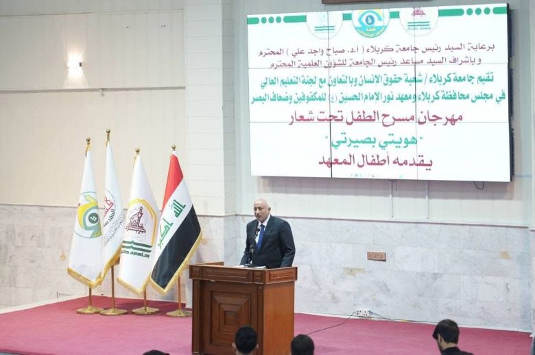 شهدت محافظة كربلاء المقدسة، اليوم الخميس، فعاليات مهرجان مسرح الطفل الذي نظمته جامعة كربلاء / شعبة حقوق الإنسان، بالتعاون مع لجنة التعليم العالي في مجلس المحافظة ومعهد نور الإمام الحسين (ع) للمكفوفين وضعاف البصر التابع لـ العتبة الحسينية المقدسة، تحت شعار "هويتي بصيرتي"، وبحضور رسمي وأكاديمي واسع.