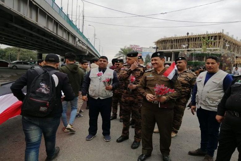 بادرت القوات الأمنية في محافظة كربلاء المقدسة، اليوم الأحد، إلى توزيع الورود والأعلام العراقية على المتظاهرين وطلبة الجامعات الذين انضمّوا الى التظاهرات الاحتجاجية في المحافظة.