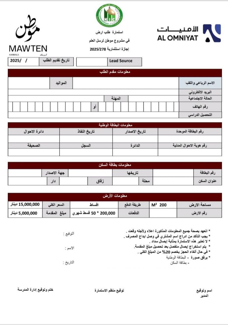 أعلنت مديرية تربية كربلاء المقدسة، اليوم الاحد، عن بدء التقديم على مشروع الأراضي السكنية ضمن مشروع المطوّر العقاري، مؤكدة أن التقديم سيكون حصراً عبر الاستمارة المعدّلة المرفقة مع هذا الإعلان.