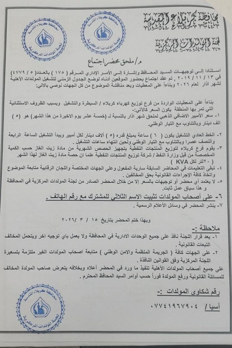 كربلاء تحدد تسعيرة الأمبير وساعات تشغيل المولدات للنصف الأخير من آذار بسبب الظروف الاستثنائية