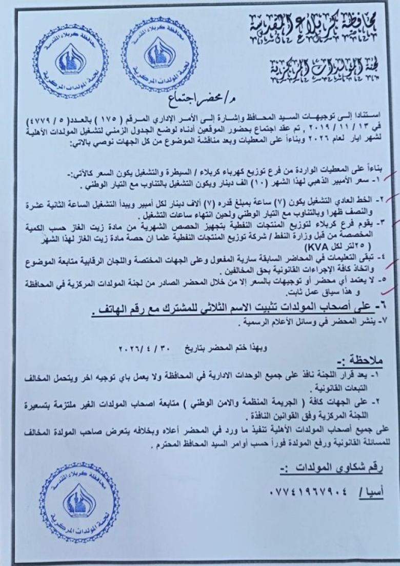 ونوهت اللجنة "على جميع أصحاب المولدات الأهلية تنفيذ ما ورد في المحضر أعلاه وبخلافه يتعرض صاحب المولدة المخالف للمسائلة القانونية ورفع المولدة فورا حسب أوامر السيد المحافظ".