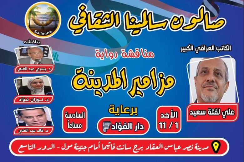 فقد شهد صالون سالمينا الندوة الأولى واقيمت بالتعاون مع دار الفؤاد المصرية التي اصدرا للروائي خمس روايات عن رواية مزامير المدينة والتي قدمتها الروائية المصرية المبدعة علياء هيكل وقالت نحن امام قامة عربية حققت حضورها الكبير في الساحة الروائية العربية