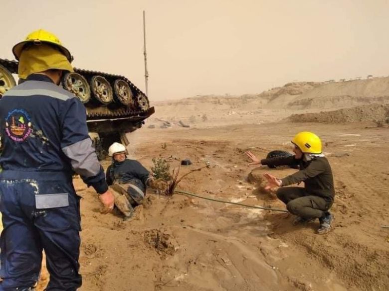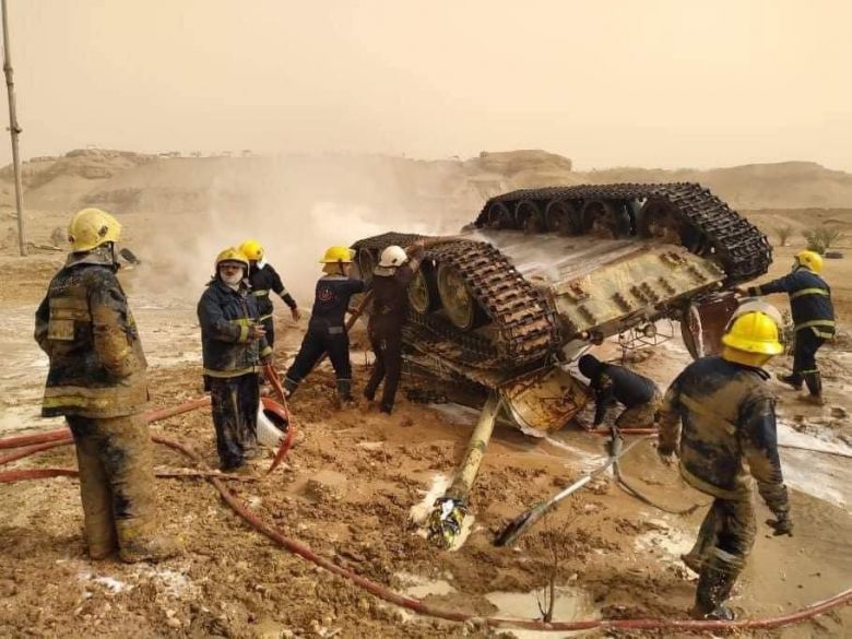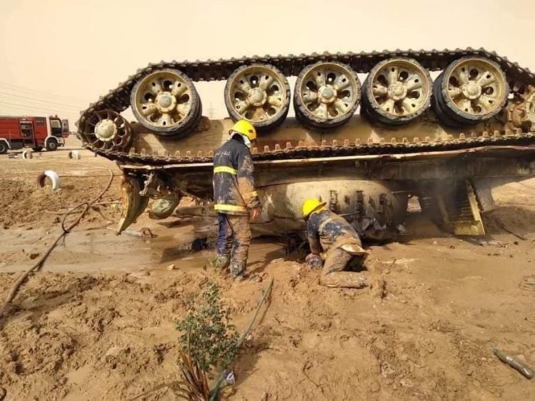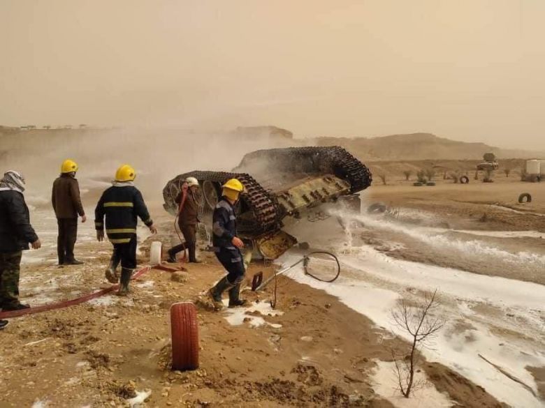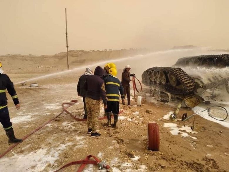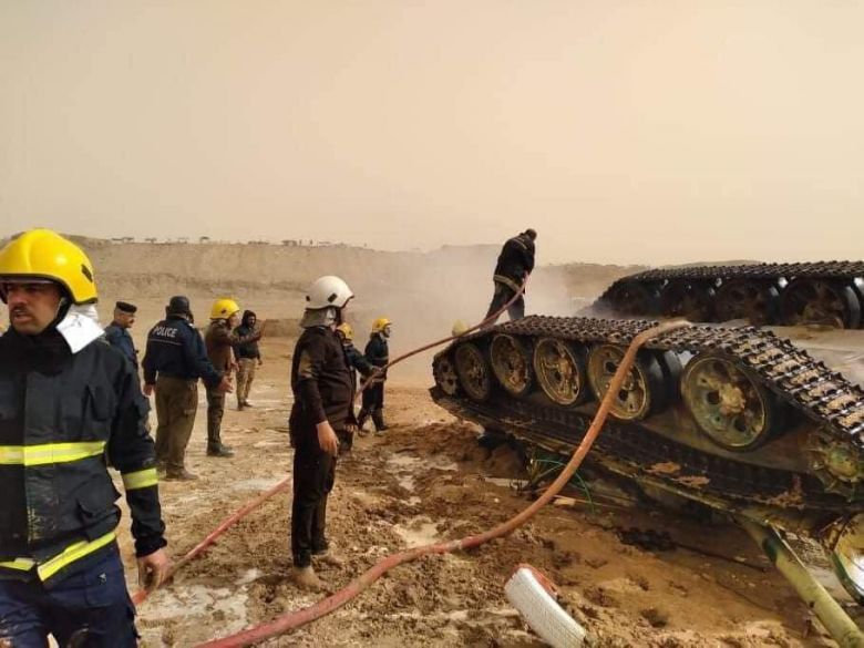 واشار الى مباشرة كوادر الدفاع المدني بإخماد حريق الدبابة ، والحيلولة دون انفجار الذخائر الحية فيها.