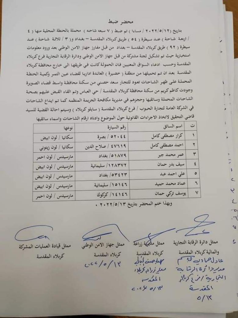 واشار الى، انه "تم توقيع محضر ضبط بهذا الشأن من قبل مديرية زراعة كربلاء المقدسة ودائرة الرقابة التجارية فرع كربلاء وجهاز الأمن الوطني وقيادة العمليات المشتركة".