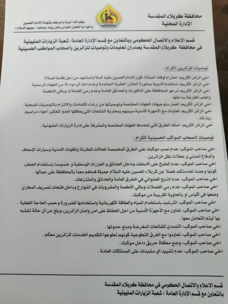 وذكر الحبالي في تصريح لـ (موقع كربلاء الإخباري) أنّ "قسم الإعلام والاتصال الحكومي وبالتعاون مع قسم العلاقات والإعلام بمديرية شرطة كربلاء وشعبة الشرطة المجتمعية، نفّذوا حملة توعوية بين الزائرين وأصحاب المواكب الحسينية؛ بهدف محاربة الشائعات خلال أيام الزيارة المباركة".