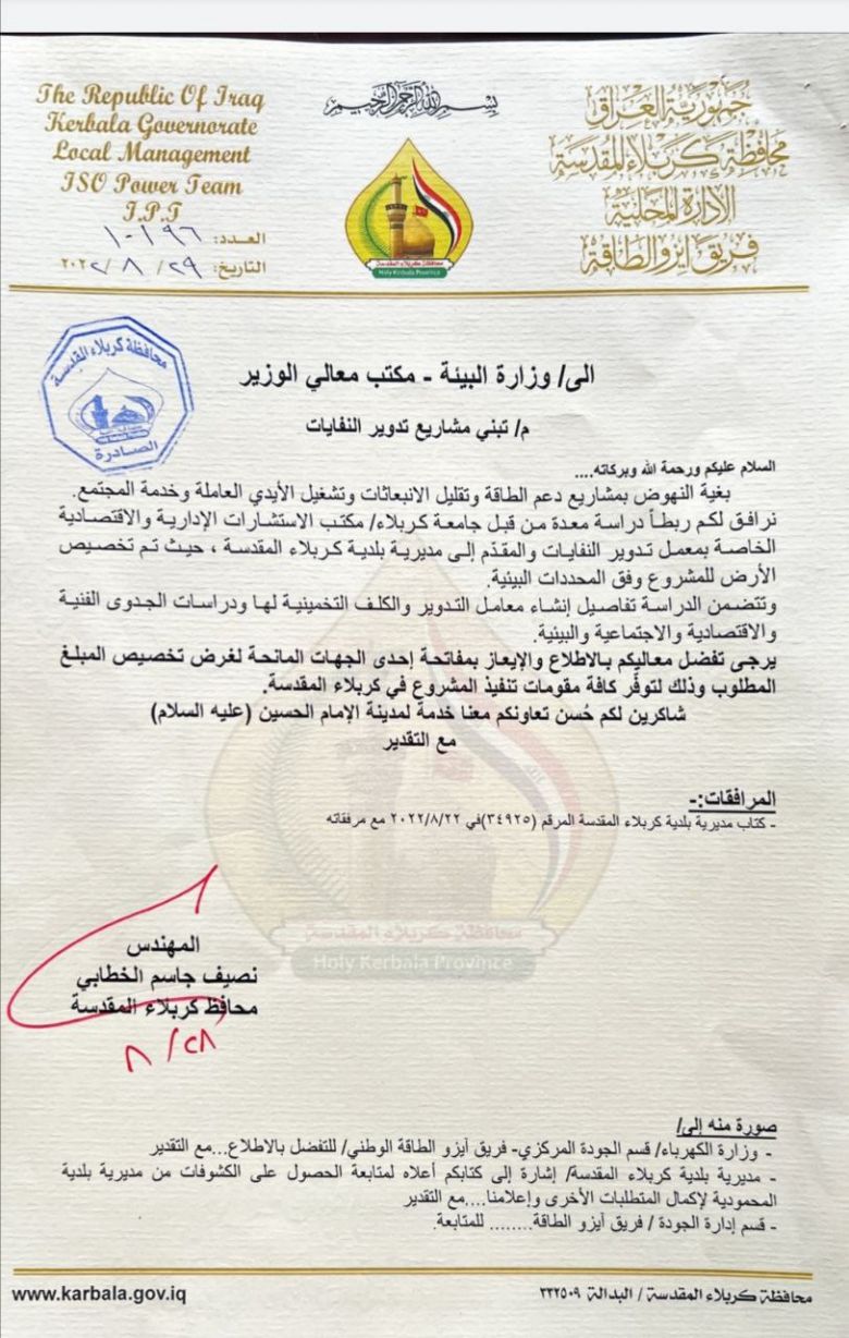 وقال محافظ كربلاء المقدسة نصيف جاسم الخطابي في تصريح لموقع كربلاء الاخباري، ان "محافظة كربلاء تبنت مشاريع تدوير النفايات وبالتعاون مع مكتب الاستشارات الادارية والاقتصادية التابع لجامعة كربلاء الخاص بمعمل تدوير النفايات من خلال الدراسة المقدمة الى مديرية بلدية كربلاء المقدسة حيث خصصت المحافظة الأرض الخاصة بإنشاء المشروع ووفق المحددات البيئية البالغة ٢٠٠ دونم".