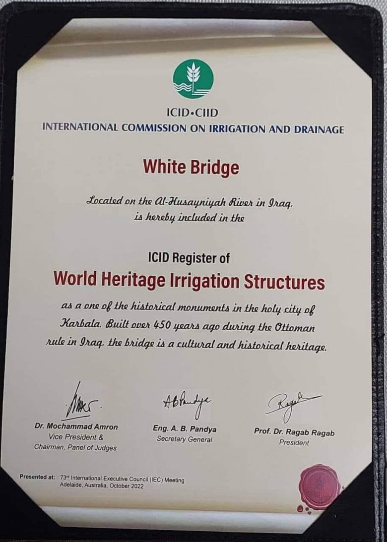 وقالت خلية الإعلام الحكومي للأمانة العامة في بيان تلقى موقع كربلاء الاخباري على نسخة منه ، "أن الاجتماعات التي عقدت من قبل المجلس التنفيذي الثالث والسبعين للمنظمة الدولية للري والبزل (ICID) في السادس من الشهر الحالي بمدينة اديليد جنوب استراليا أثمرت عن ادراج معالم اثرية في محافظات العراق سجلت ضمن التراث العالمي للري ، موضحةً اهمها منشأ القنطرة البيضاء في كربلاء المقدسة" .