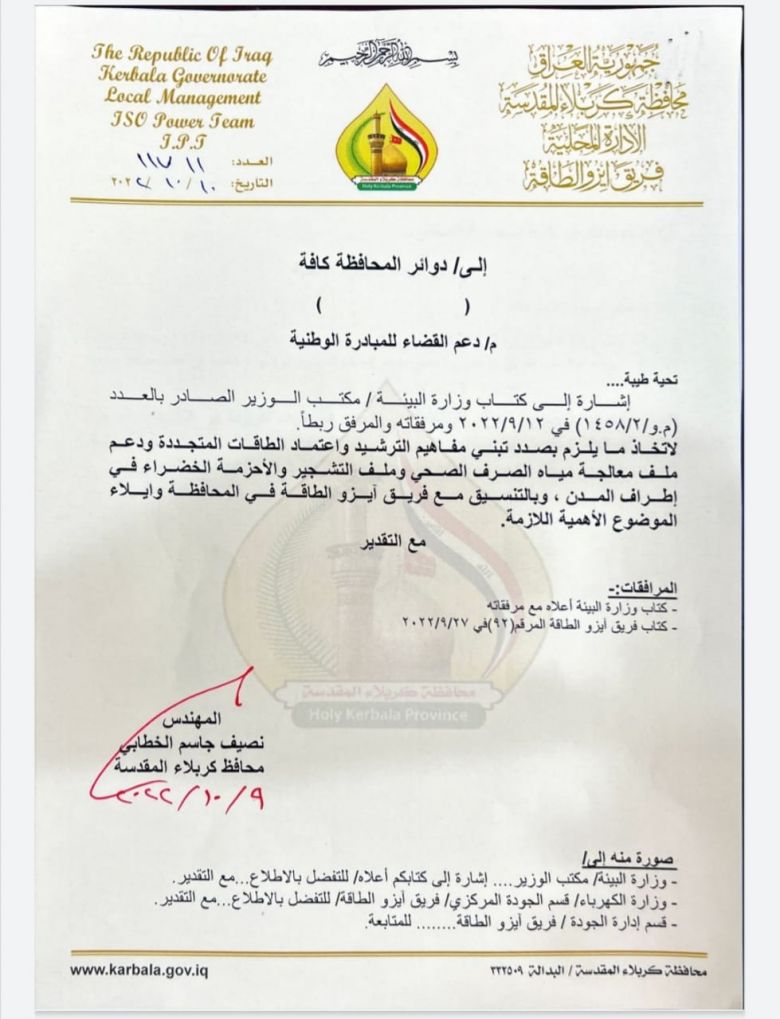 وقال محافظ كربلاء المقدسه نصيف جاسم الخطابي خلال اعمام موجه إلى الدوائر الحكوميه كافة، بأن "كربلاء كانت من المحافظات السباقة في تنفيذ متطلبات المبادرة الوطنية لدعم الطاقة من خلال انشاء المساحات الخضراء والاحزمة الخضراء المحيطة بالمدينة و تبني اعتماد الطاقات المتجددة ودعم ملفات معالجة مياه الصرف الصحي".