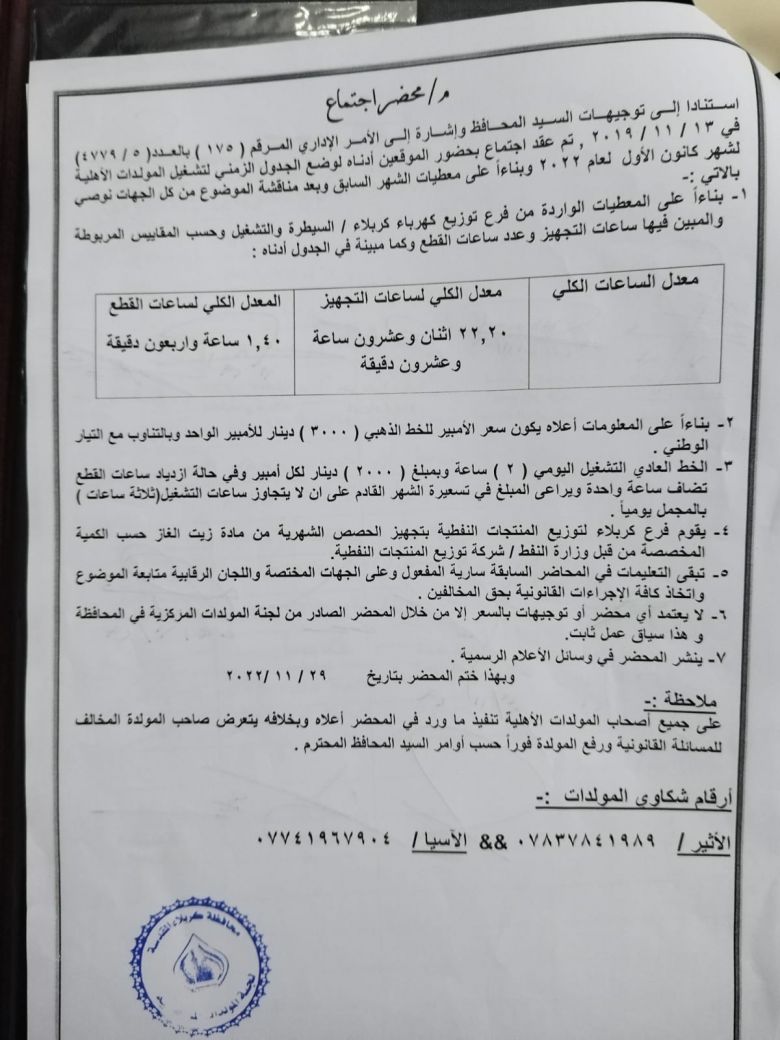 استنادا الى توجيهات محافظ كربلاء المقدسة المهندس نصيف جاسم الخطابي، تم عقد اجتماع لوضع جدول زمني لتشغيل المولدات الاهلية لشهر كانون الاول وبناءا على معطيات الشهر السابق اصبح سعر الامبير الذهبي(٣٠٠٠) دينار للامبير الواحد وبالتناوب مع التيار الوطني