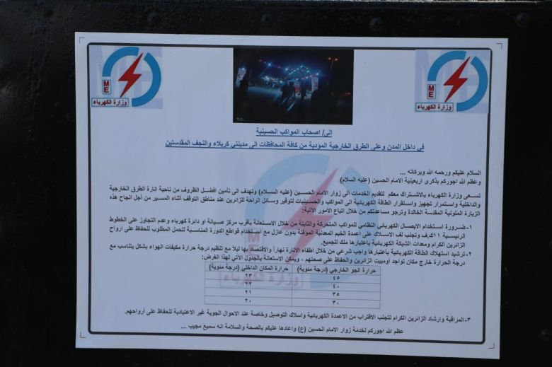 واضاف، ان "من ضمن الارشادات ضرورة ايصال التيار الكهربائي النظامي للمواكب المتحركة والثابتة من خلال الاستعانة باقرب مركز صيانة او دائرة كهرباء وعدم الربط الغير نظامي على مكونات الشبكة الكهربائية".