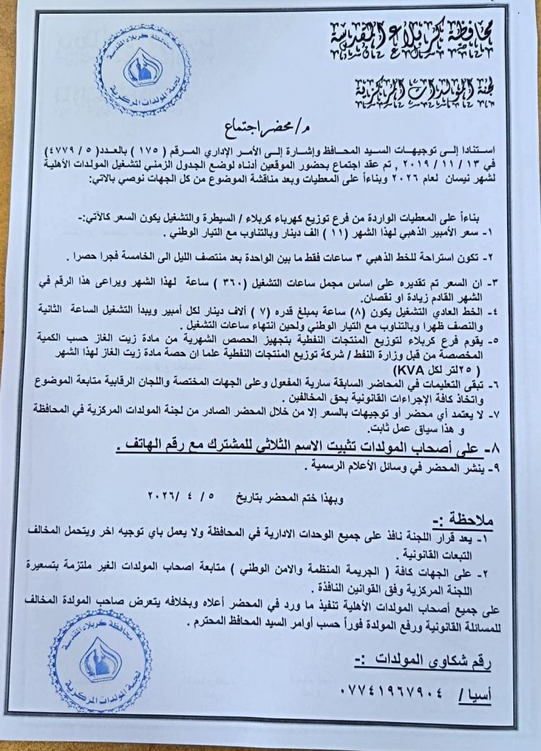 كربلاء تحدد تسعيرة الأمبير وساعات تشغيل المولدات لشهر نيسان